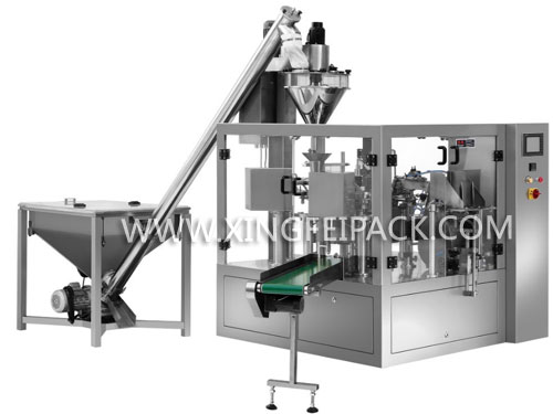 旋轉(zhuǎn)式給袋式自動(dòng)包裝機(jī)適用于平面袋,自立袋,拉鏈袋等各種形狀的熱封的復(fù)合袋.