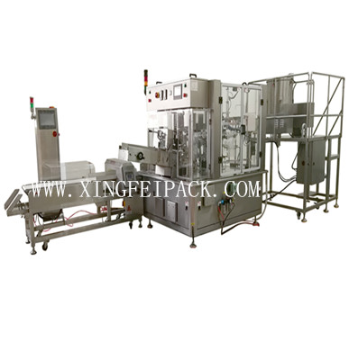 包裝流程(工位分布):1)上袋—2)色帶(噴碼)打碼(選項(xiàng))—3)開自立袋底—4)開袋口—5)一次充填—6)二次充填(選項(xiàng)或者備用)—7)熱封口(同時排氣)—8)冷封口和產(chǎn)品輸出。