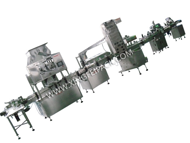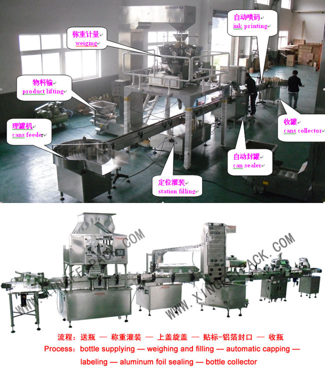 顆粒灌裝生產(chǎn)線用于顆粒物料的瓶裝和罐裝,瓶裝線包含供瓶-稱重灌裝-旋蓋 –貼標-鋁箔封口-收瓶, 罐裝線包含,供瓶-稱重灌裝-封罐-噴碼-收瓶, 具體可按照要求定制。 適用于固體類如咖啡,堅果,大米,果蔬,薯條等零食